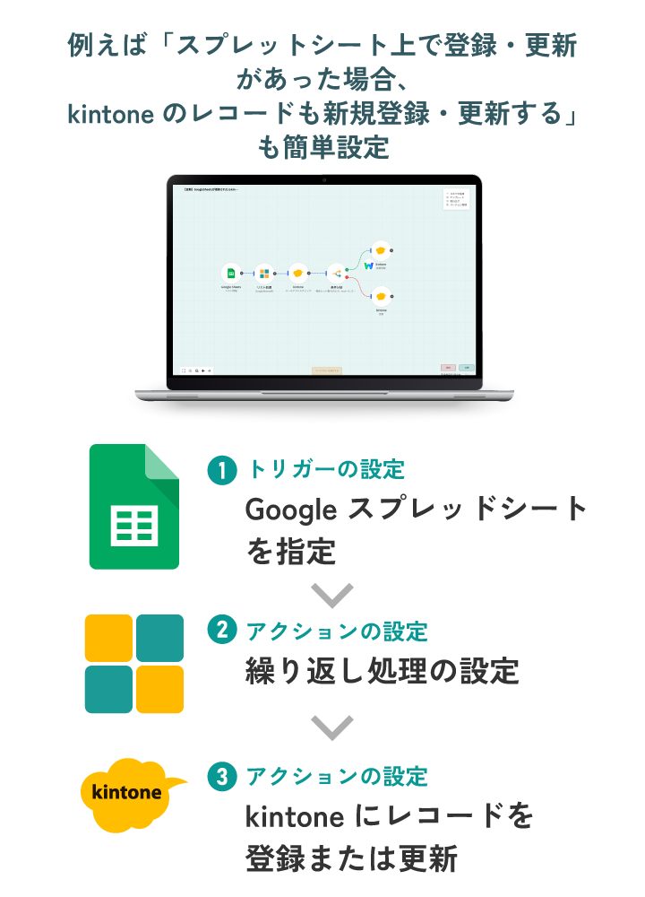 kintoneで管理するレコード情報が新規登録または更新されたら、スプレッドシートにも自動で反映。